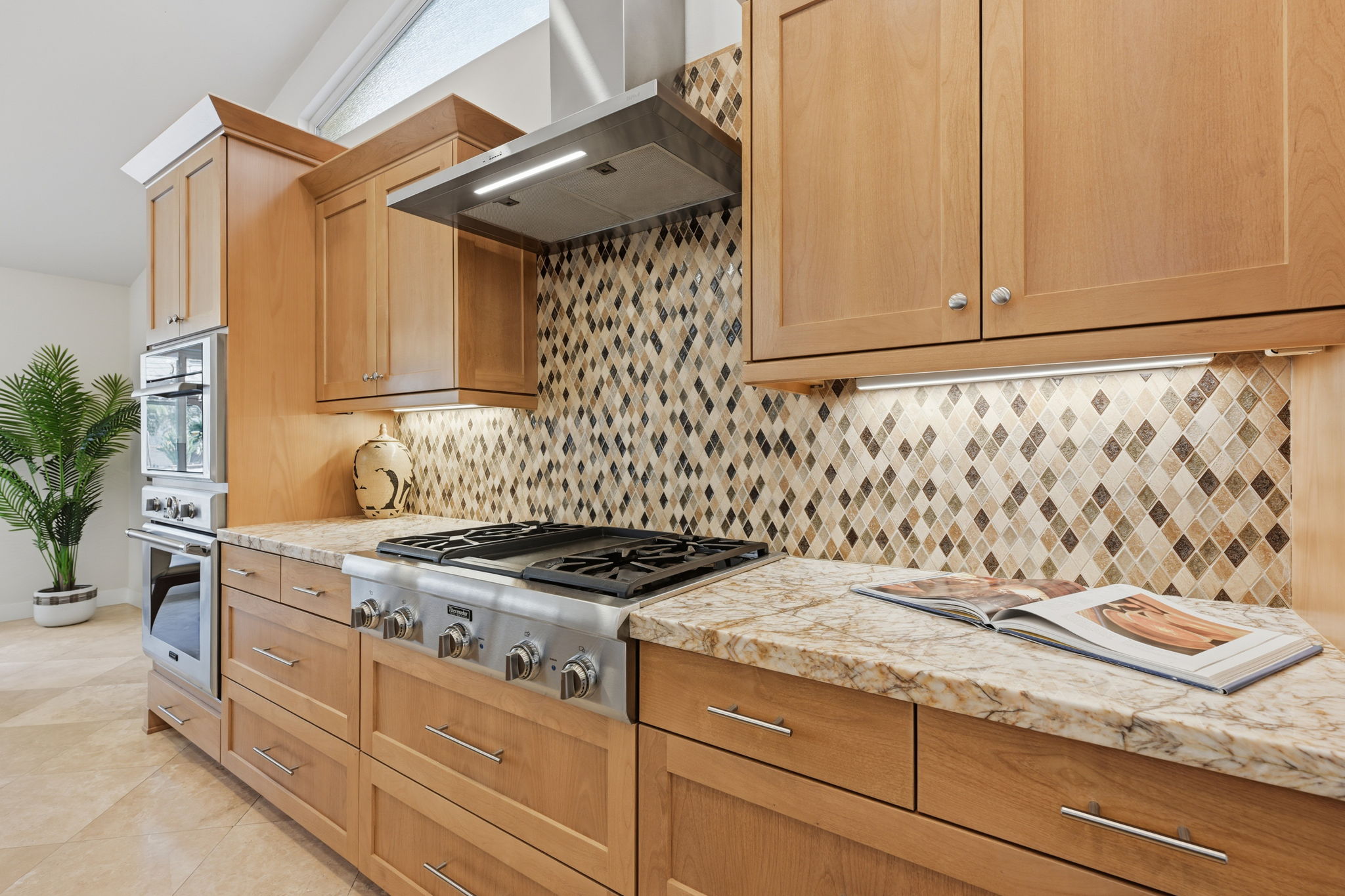 The chef’s kitchen is equipped with alder shaker cabinetry, quartzite countertops, a walk-in pantry, & premium appliances, including a 36” range with griddle, Thermador steam oven, Miele convection microwave, Bosch built-in coffee machine, and InstaHot dispenser.